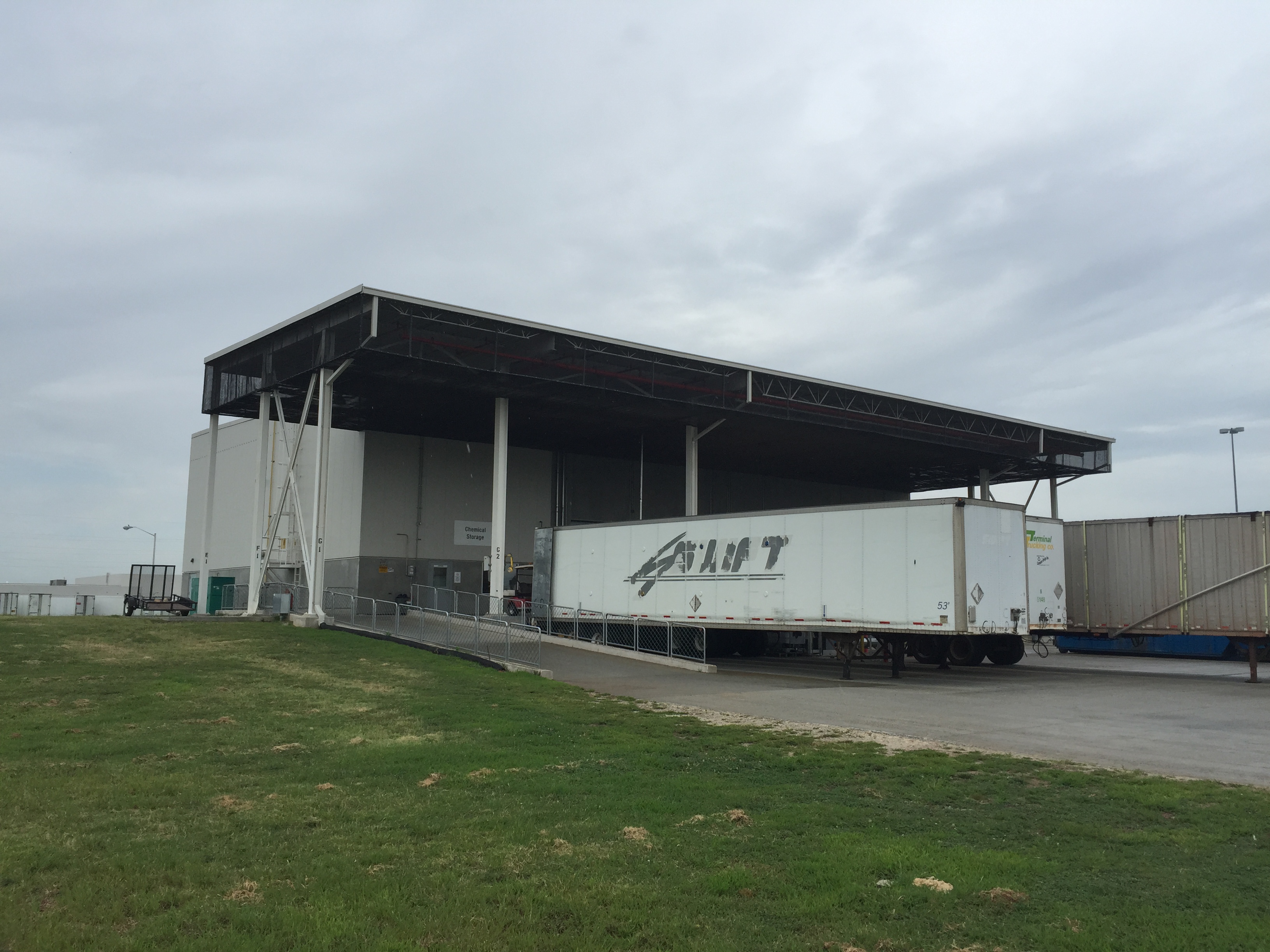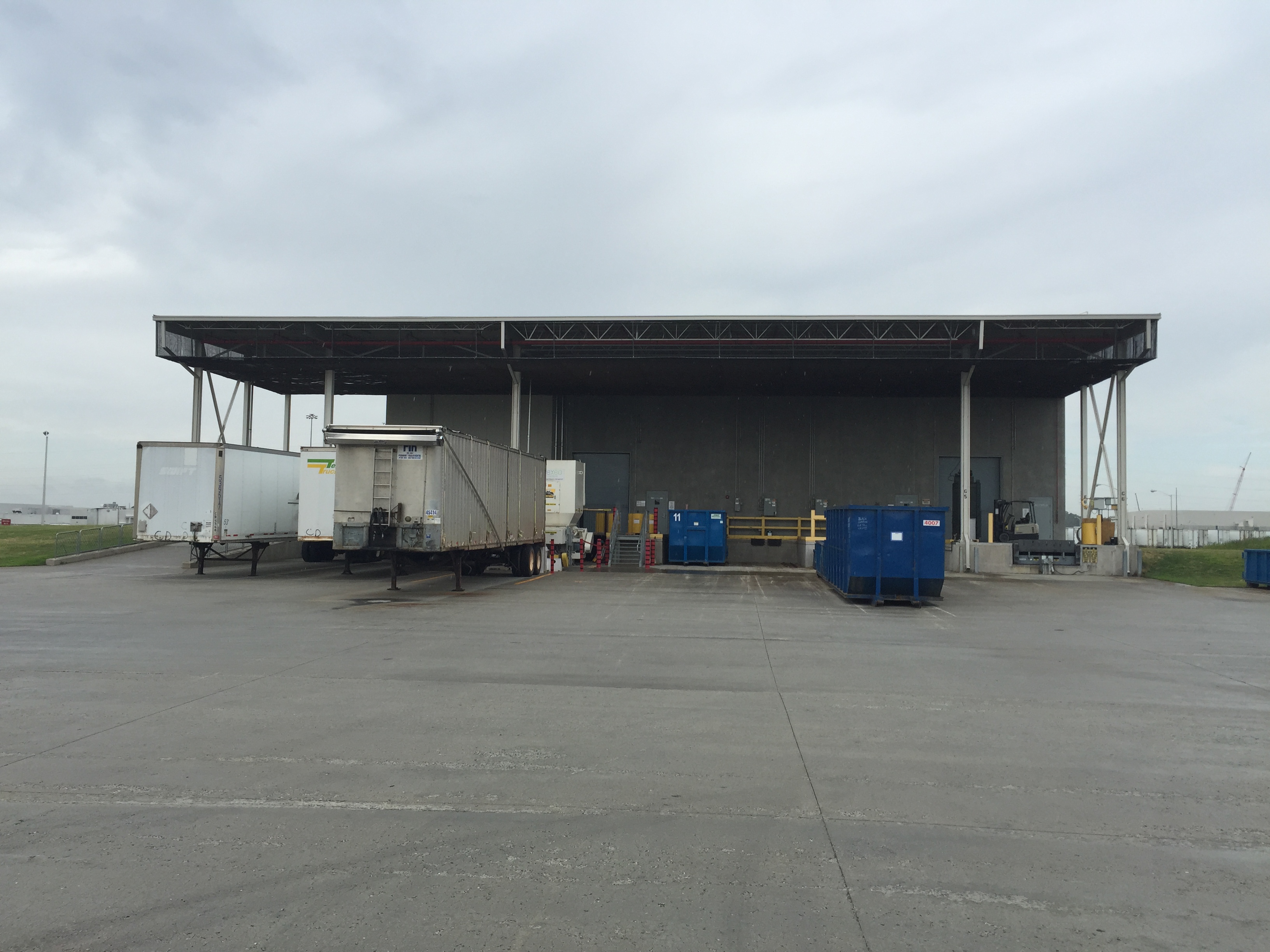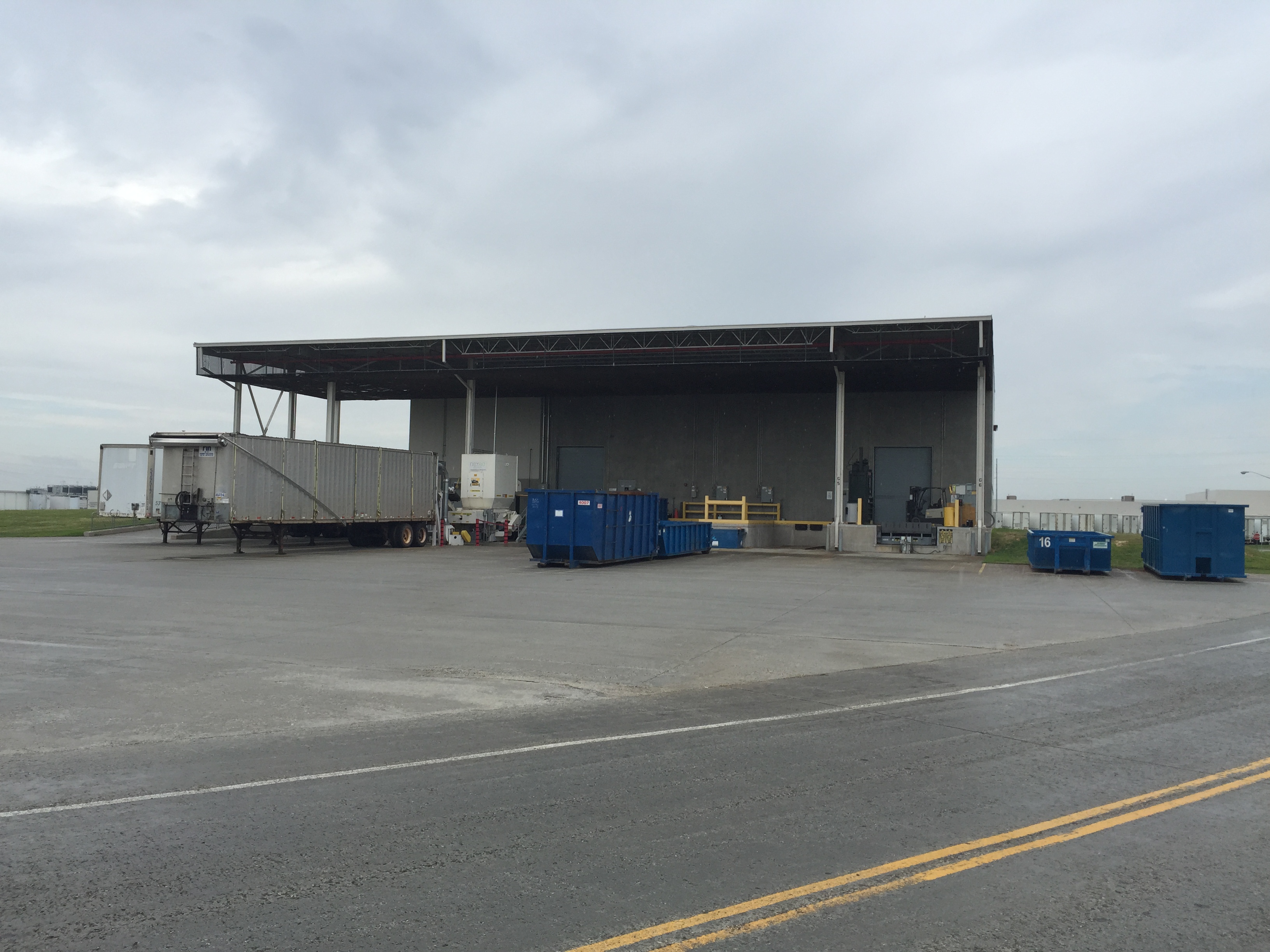 Plant 10.2 CSB is also designed with a covered Finger Dock system to provide environmental protection for truck docking stations and waste disposal container fixed positions. The design provides for four docks and four fixed disposal container locations between concrete finger docks which provide side, front and rear access to each position. The dock ramp area is sloped to an exterior trench drain system which provides spill containment for the ramp area and is designed to prevent stormwater contamination. The dock area also includes a covered drive-in ramp to allow direct access of forklifts and delivery vehicles to Inbound and Outbound Storage areas.