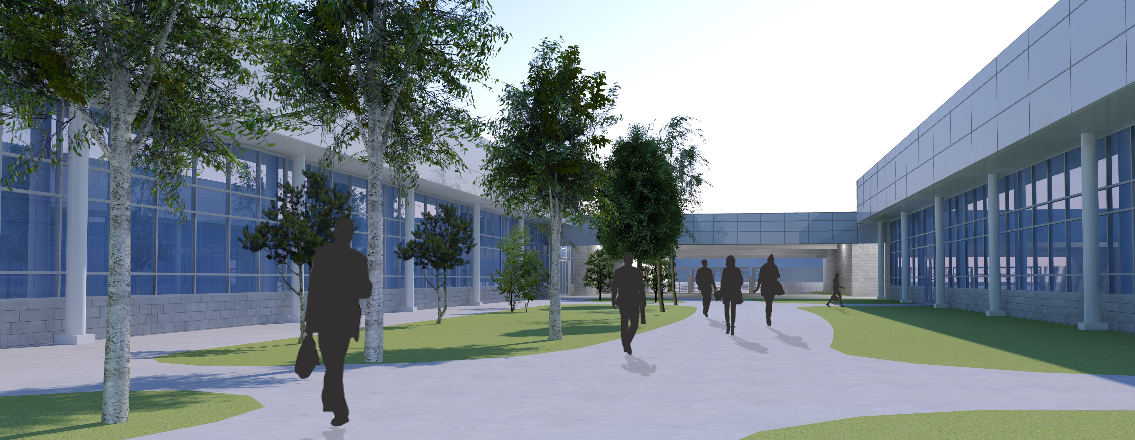 The project includes several program components dictating a fluid solution to act as a central core for the campus. The facility houses the security office and entry gate for all employees. Support areas including a large cafeteria and toilet facilities comprise the adjoining wing of the building creating a gathering space for the plant. A landscaped courtyard serves to break the secure / unsecure areas of the facility and to direct circulation to the entry points for employees & visitors. The courtyard layout also provides ample connection to the exterior for all areas of the facility.