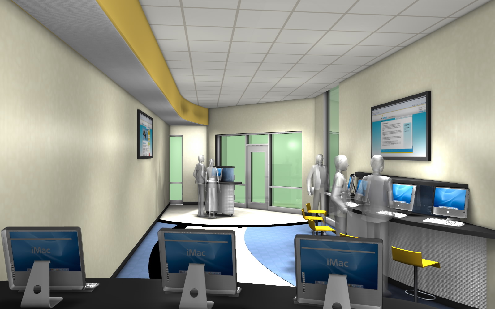 The project worked from conceptual design to construction documents, and also included interior renderings. The development of a consistent design that would serve as branding and customer recognition for the other stores to come was very important. We designed the iconic yellow stepped soffit piece over the main work area that was created directly from the wave bands in the company logo. The design of the store incorporates a lot of curves because of the logo and also because of how it helps to transform the typical retail store box. We wanted to create a sense of movement for the customers as they enter the store. Also required was the design and construction of several custom casework pieces that would be in all of the stores. These pieces also needed to be able to fit into all of the future stores, be easily reproducible, and be part of the company image.