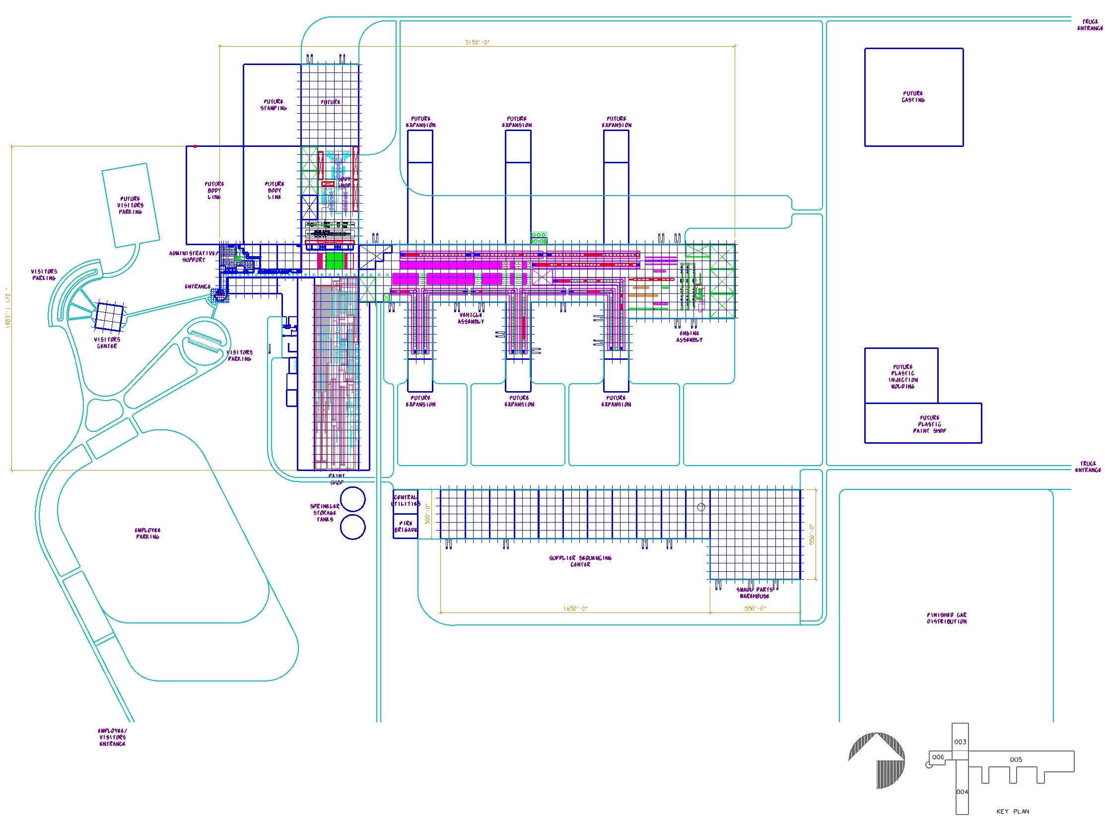 The result is a 2.8 million square foot facility that represents the newest generation of car manufacturing techniques. The site master plan hinges on a compact final assembly area containing two assembly lines. The two lines are designed using a finger concept, allowing both the building and production capacity to expand with with minimal capital investment and little disruption to the manufacturing process. With a heavy emphasis on the outsourcing of subassemblies, Context Design Group reduced the line-side storage to just two hours, allowing for a smaller building footprint. An on-site supplier sequencing center provides space to kit and sequence subassemblies for Just-in-Time delivery to the line.