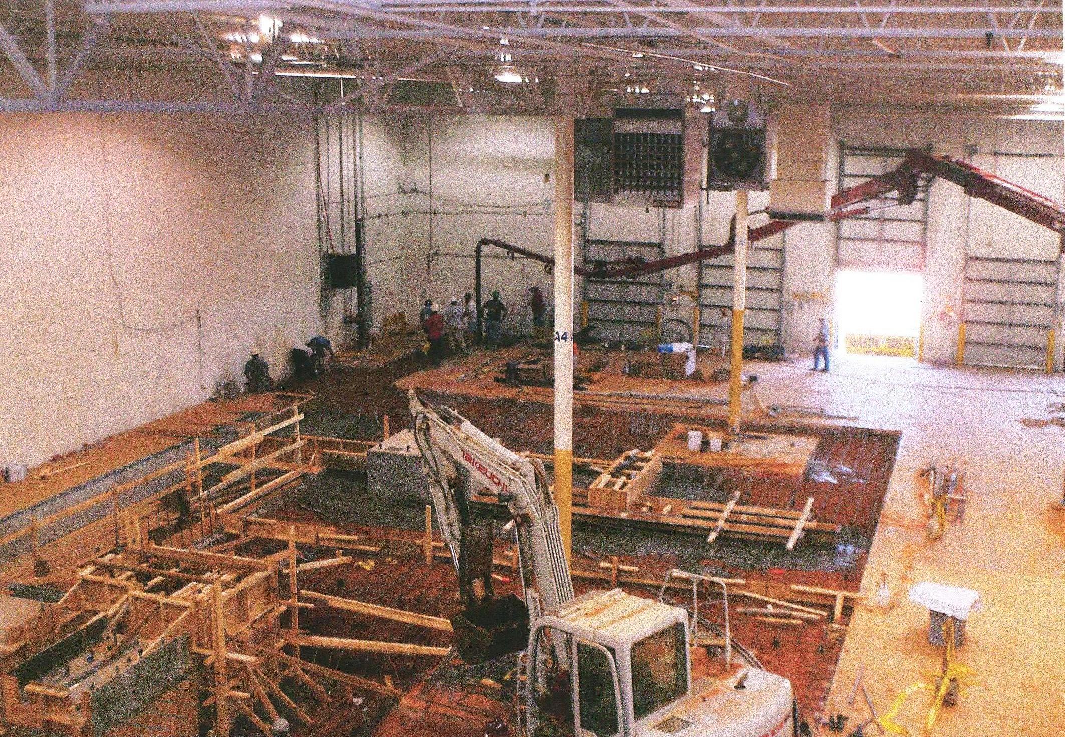 Reinforcing steel consisted of 57,000 lbs. and 30,000 lbs. respectively. Specialized large diameter anchor bolts in flexible sleeves were peppered (approximately 300) throughout to allow adjustment of the heavy machinery that could only be determined once all equipment was in place. Tolerances of .005 inches were achieved with the anchor bolt placement and this was verified by a third party surveyor working for the Architect. Included is an electrical room providing 480 and 690 volt service with fire block filled pits and wall openings. Through our coordination meetings, many extraneous details were eliminated which resulted in a more efficient and less costly design.